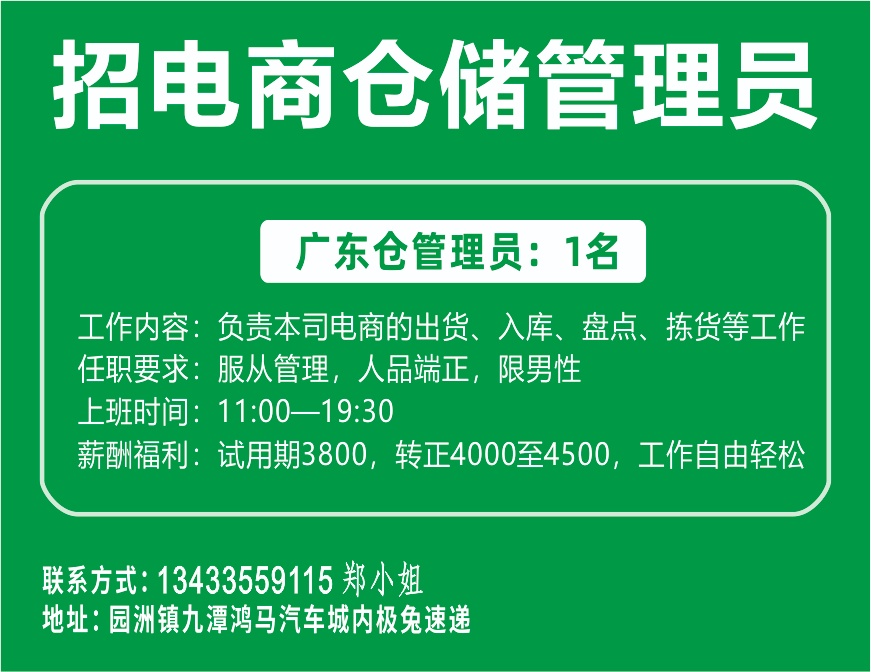 诚聘电商仓储管理员一名,有意者电联。