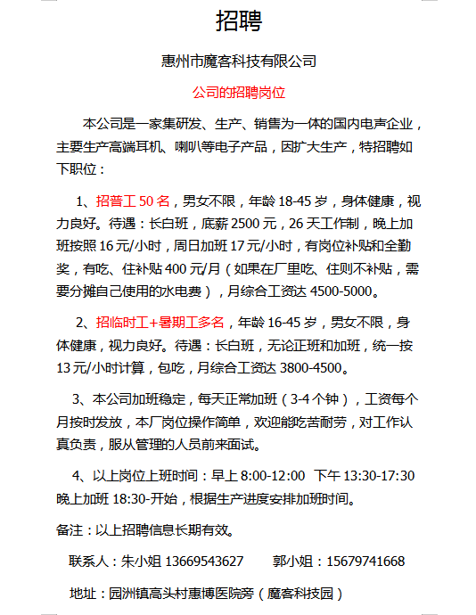 魔客科技有限公司招聘大量普工