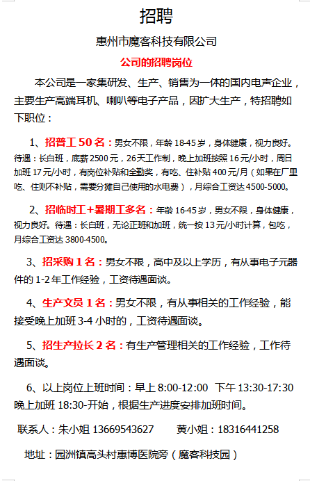 惠州魔客科技有限公司招聘生产文员,拉长,采购