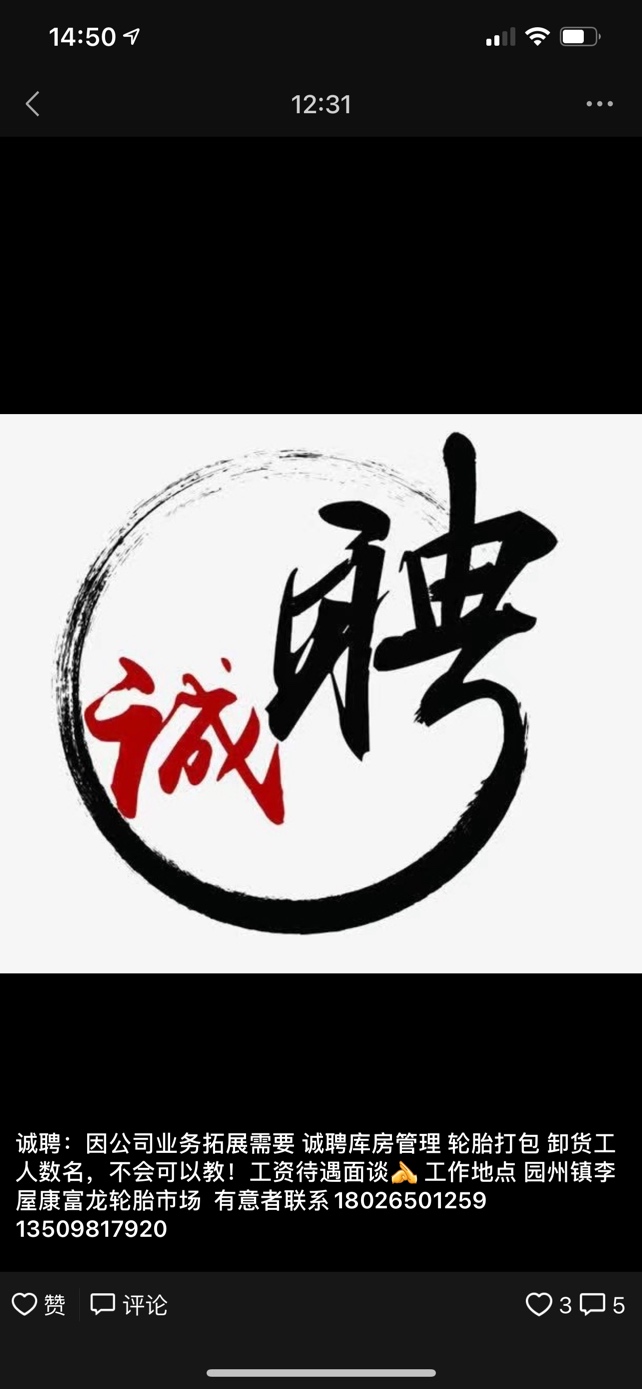 诚聘:因公司业务拓展需要 诚聘库房管理 轮胎打包 卸货工人数名,不会可以教!工资待遇面谈[抱拳] 工作地点 园州镇李屋康富龙轮胎市场 有意者联系18026501259 13509817920
