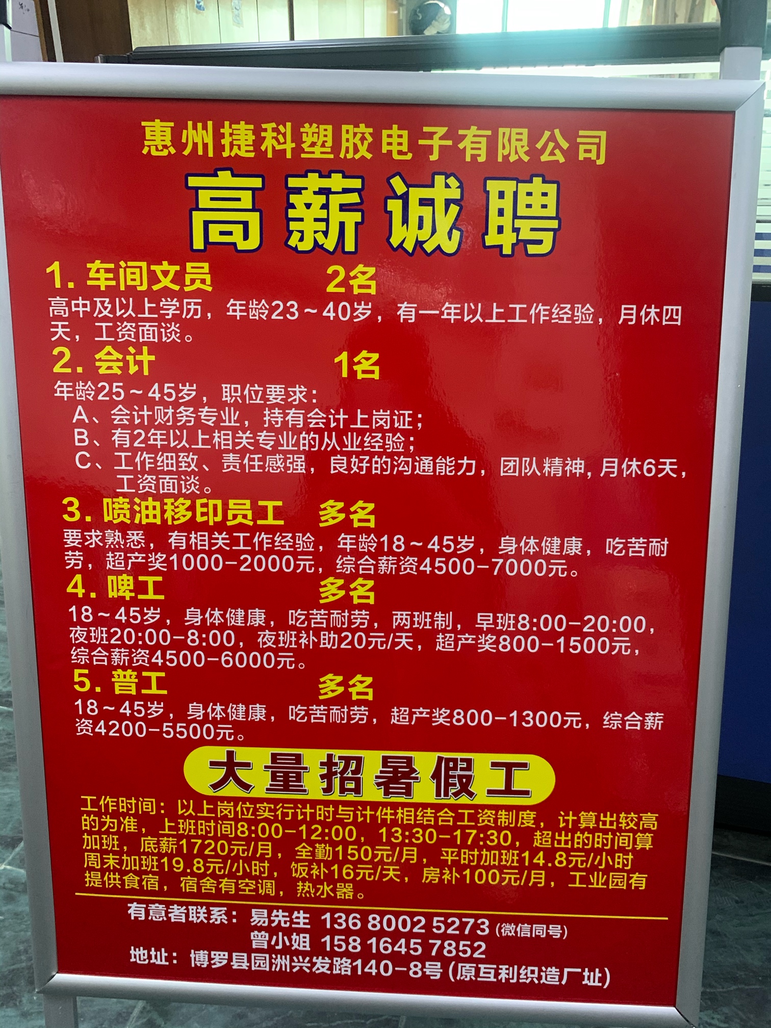 工作时间:以上岗位实行计时与计件相结合工资制度,计算出较高的为准。8点到12点,13.30分~17.30分,超出的时间算加班,底薪:1720/月,全勤150元/月,平时加班:14.8一小时,周未加班19.8一小时,饭补16元一天,房补100元一个月,工业园有提供食宿,宿舍有空调,热水器。有意者联系:曾小姐:15816457852,易先生:136 8002 5273,微信同号,地址:博罗县园洲兴发路140-8号(原互利织造厂址)