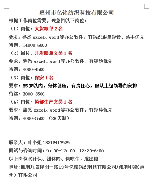 招聘招聘,文员、跟单、保安。