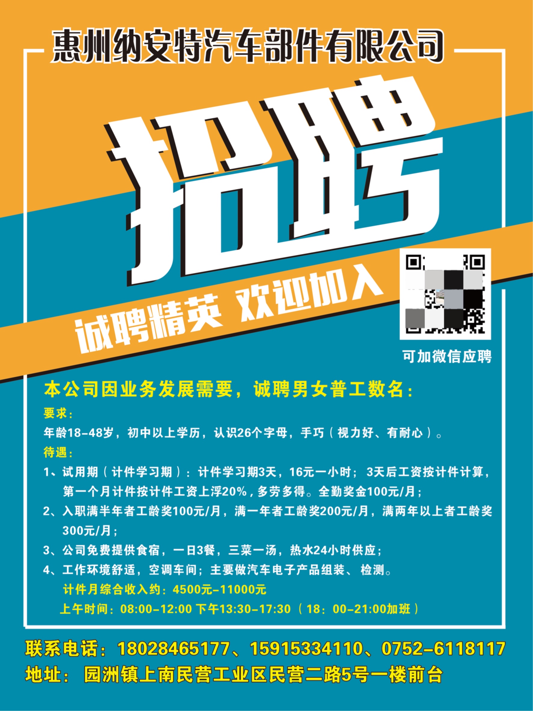 3、男女普工要求:18-40岁,吃苦耐劳;