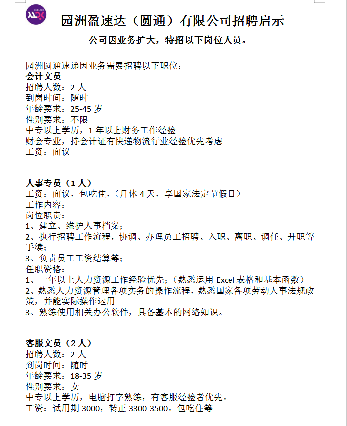 园洲盈速达(圆通)有限公司招聘公司现因业务扩大,特招以下岗位人员。