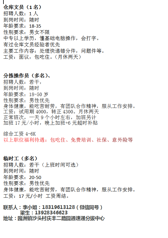 圆通速递招C牌司机一名,分拣员多名
