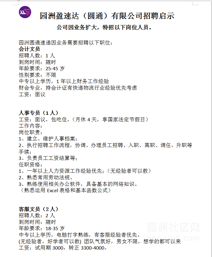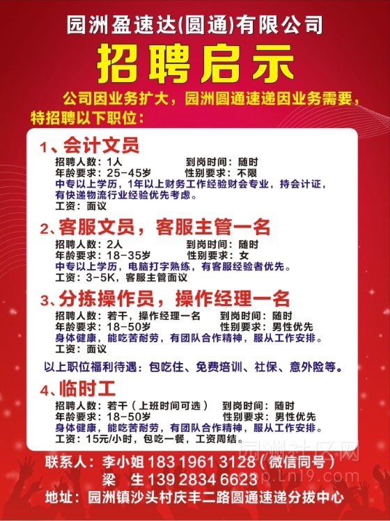 园洲盈速达(圆通)有限公司招聘公司现因业务扩大,特招以下岗位人员。