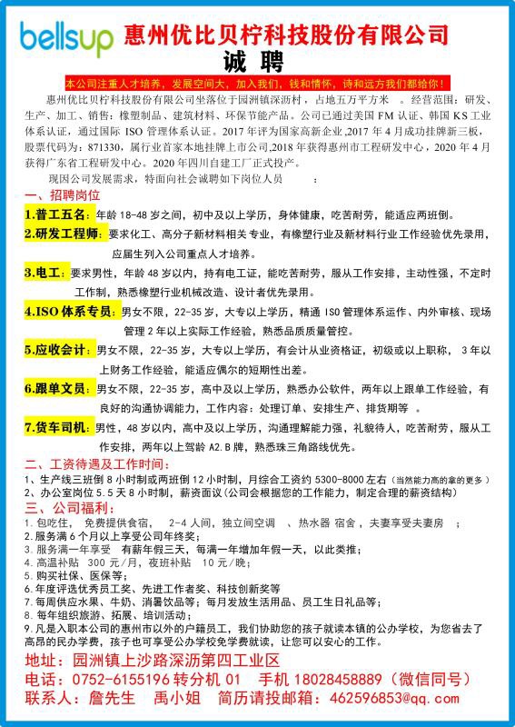 招人,招强人,招比我更强的人招有梦想的人 、惠州优比贝柠一直在招聘、从未停止、目前因公司发展需求,需要招聘各路英雄多名,男女不限,服从安排、年龄18-48左右,上班时间每天12H,每周换一次班。两班倒,综合薪资5200-6000不等(当然 能力高的拿的更多).本公司秉承着一切为员工着想的方针,坚持用心对待每一位为公司付出的辛勤劳动者,我们期待你们的加入,带着你们的梦想起飞。优比贝柠科技股份有限公司欢迎您