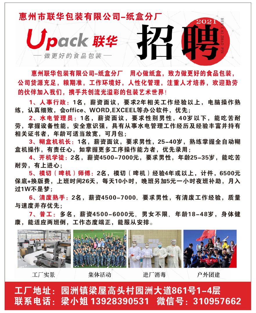 联华包装有限公司-纸盒分厂 招聘如下:1、学徒2名,薪资:4500-7000元,要求男性,年龄25-35岁,能吃苦耐劳,有上进心。2、普工多名,薪资4500-6000元,男女不限,年龄18-48岁,身体健康,能适应两班倒,工作态度端正,能服从安排。详情请联系梁小姐13928390531 陈小姐13680809431地址:园洲大道861号。