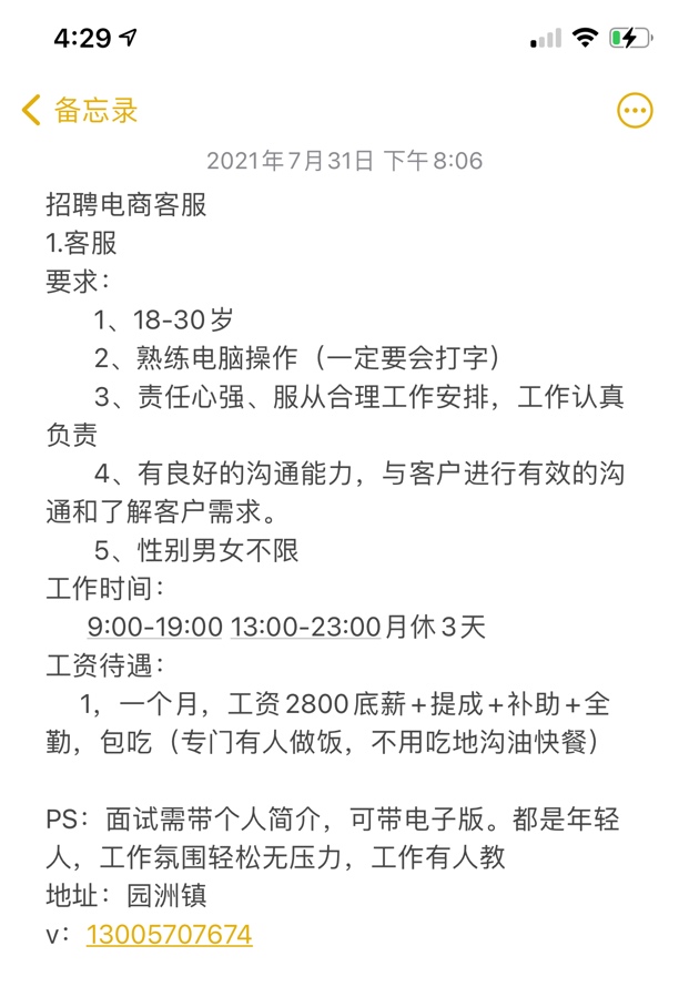 招聘电商客服 保底3400加提成 月休3天