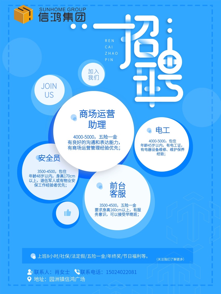 信鸿广场招聘客服、运营助理、电工、安全员