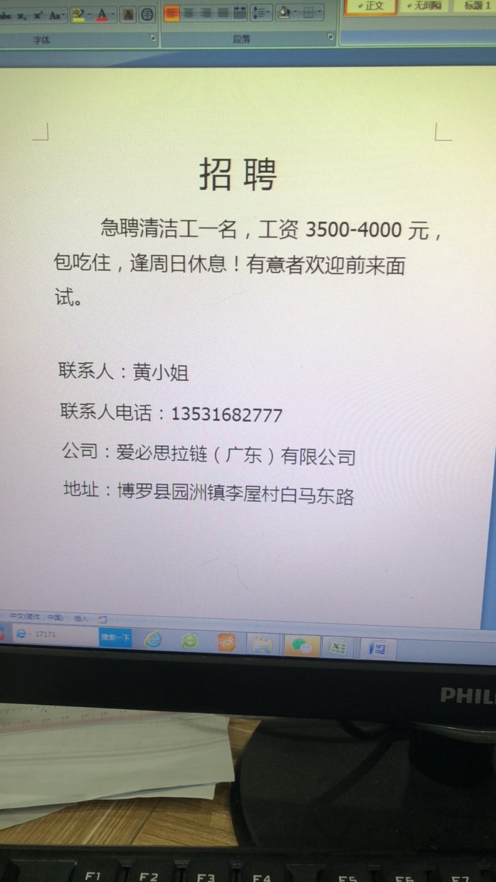 爱必思拉链(广东)有限公司招聘清洁工1名