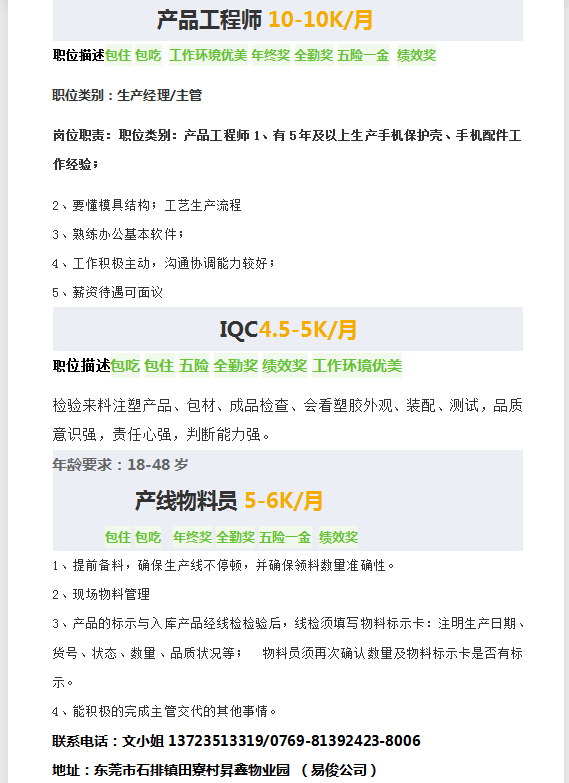 现公司急聘以下岗位工作人员, 出粮准,包吃包住,买社保,正在找工作,准备换工作的找我,一直都在, 电话13723513319同微!