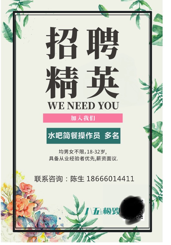 八五极致咖啡是广东地区知名的咖啡连锁品牌.现园洲八五咖啡.招聘咖啡师数名.生熟手皆可.长期工 临时工皆可。年龄:18-35周岁.上班8小时.底薪+补助+提成+加班费+节假日福利.综合工资3500—4200元.有兴趣的可电话微信联系。电话18666014411