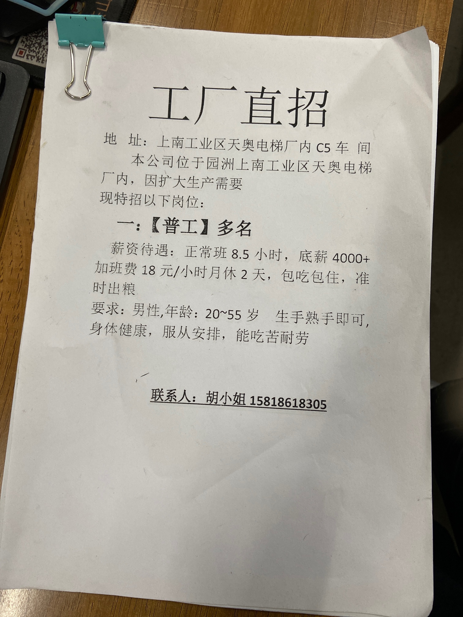 急招男女普工多名,生熟手即可,有意者电联