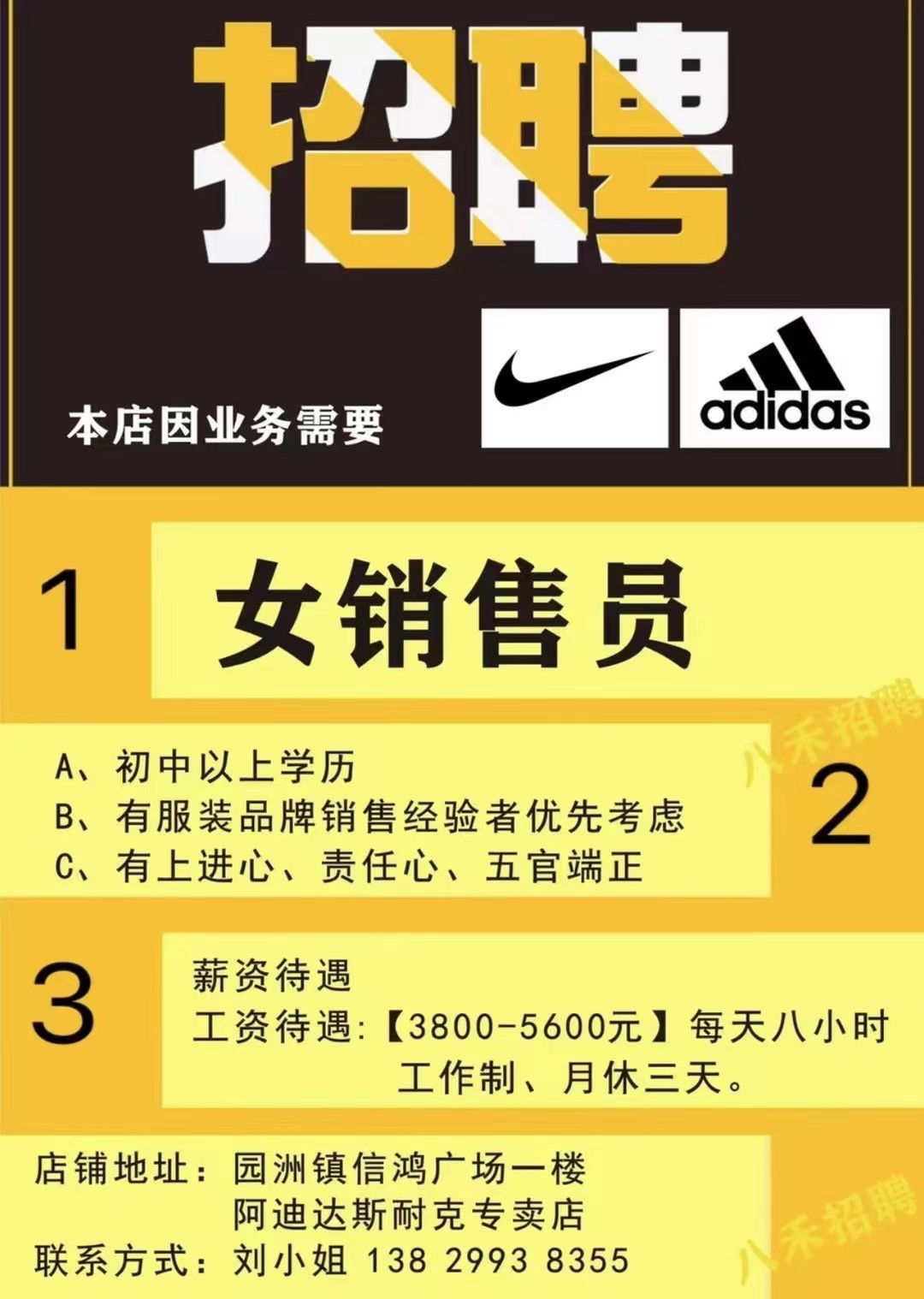 园洲新三新耐克,阿迪达斯招聘优秀导购员