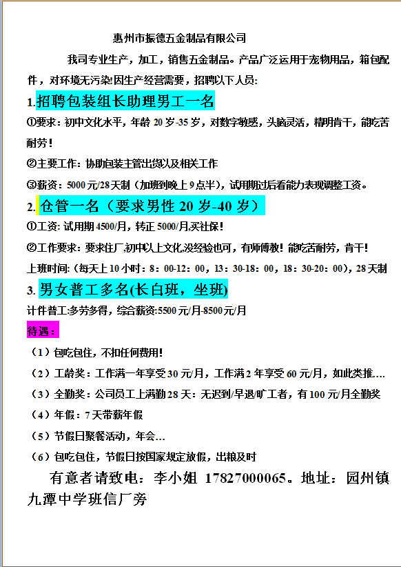 招聘仓管,男女普工,包装组长助理