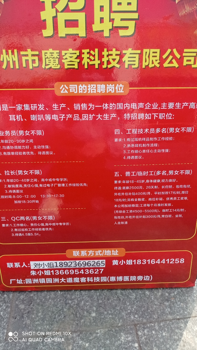 惠州市魔客科技有限公司大量招聘长期工,临时工