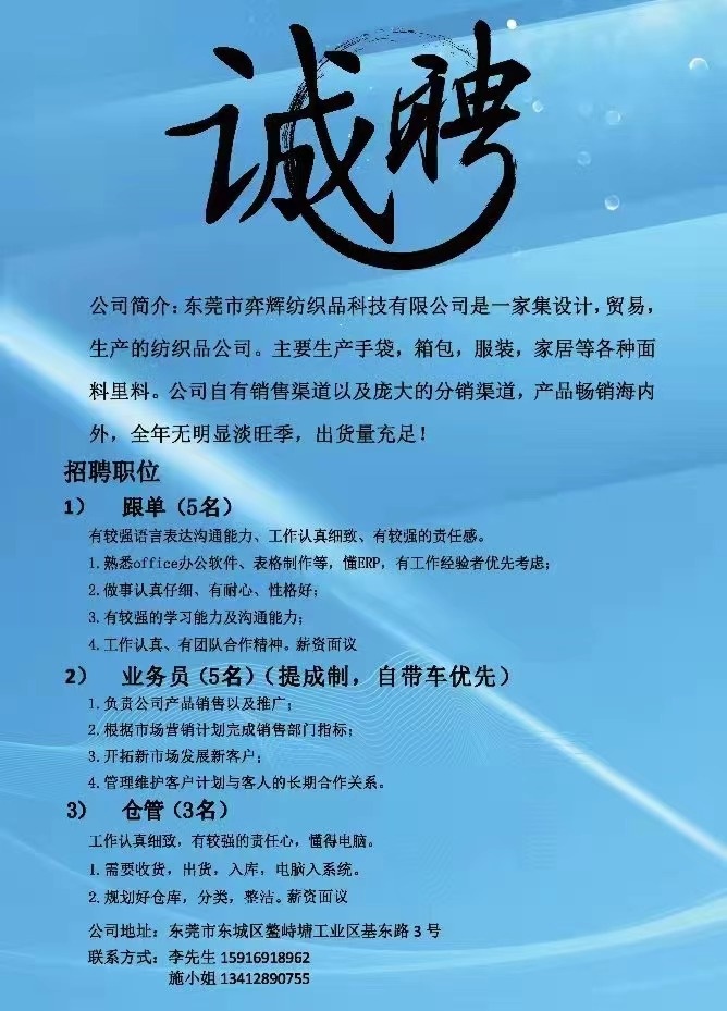 招聘各部门精英,有意者请联系