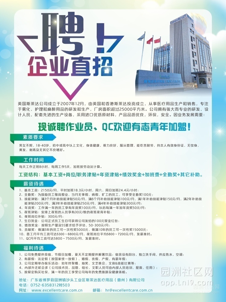 斯莱达医疗用品有限公司大量招聘普工(5300-7200元/月)