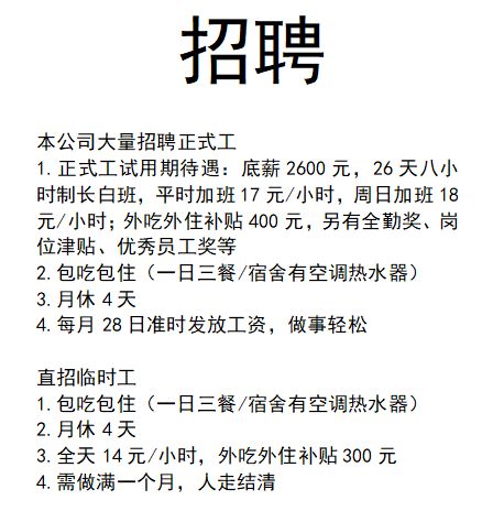 薪资待遇:底薪2600元,26天制,长白班,包吃包住,外吃外住补贴400元/月,平时加班17元/小时,周日加班18元/小时;另有全勤奖、岗位津贴、优秀员工奖等。