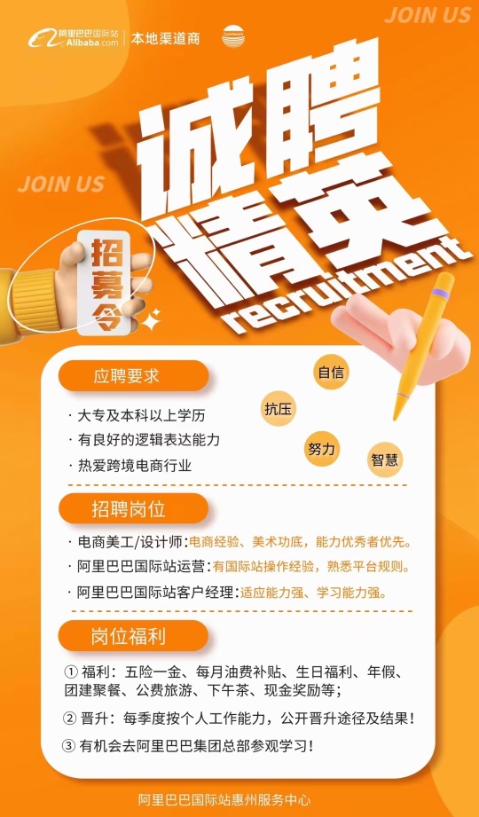 主要工作是针对惠州的中小型企业客户,通过电话和实地拜访的模式,让企业入驻我们阿里国际站平台,做平台招商工作