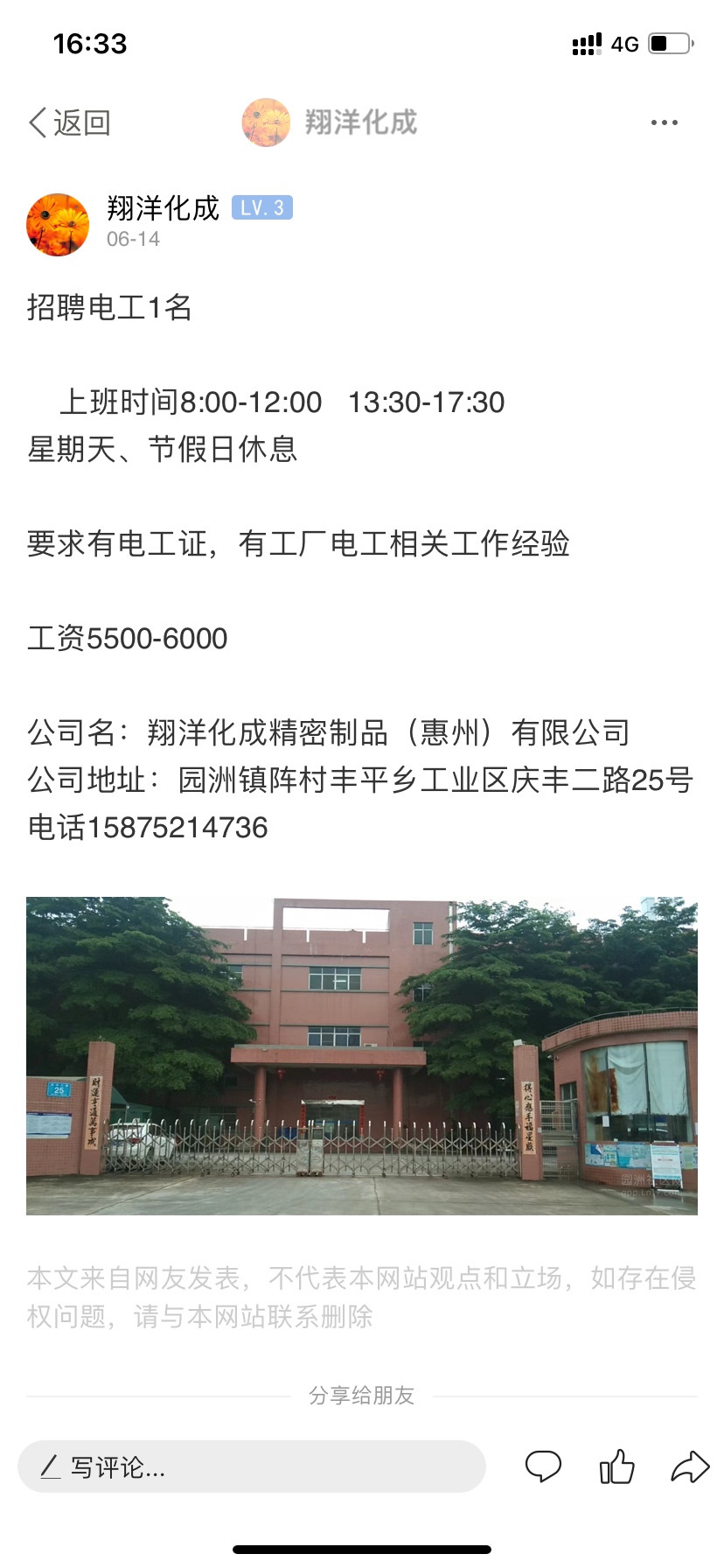 招聘电工一名