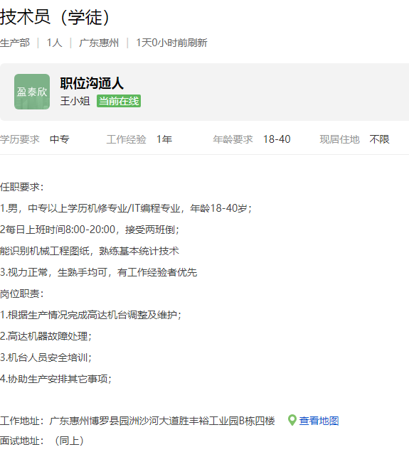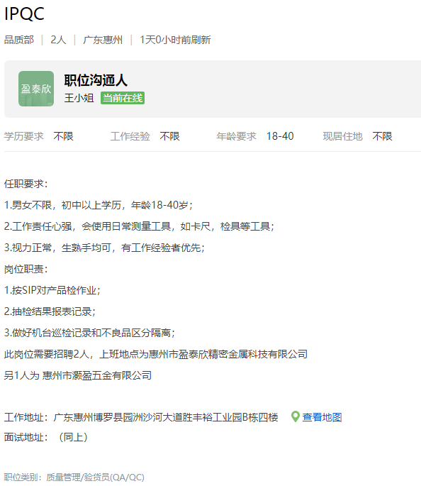 惠州市盈泰欣精密有限公司招聘职位